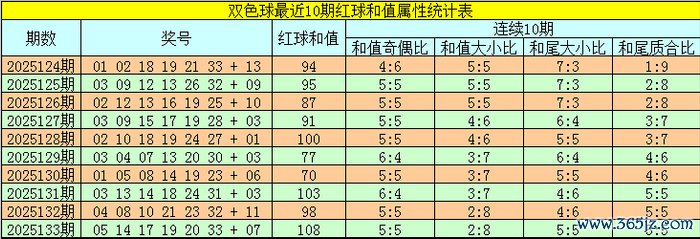 双色球红球最近10期开出和值分辨为:94、95、87、91、100、77、70、103、98、108。